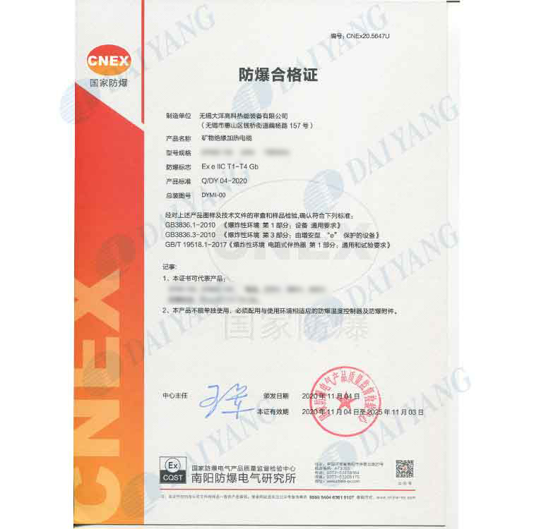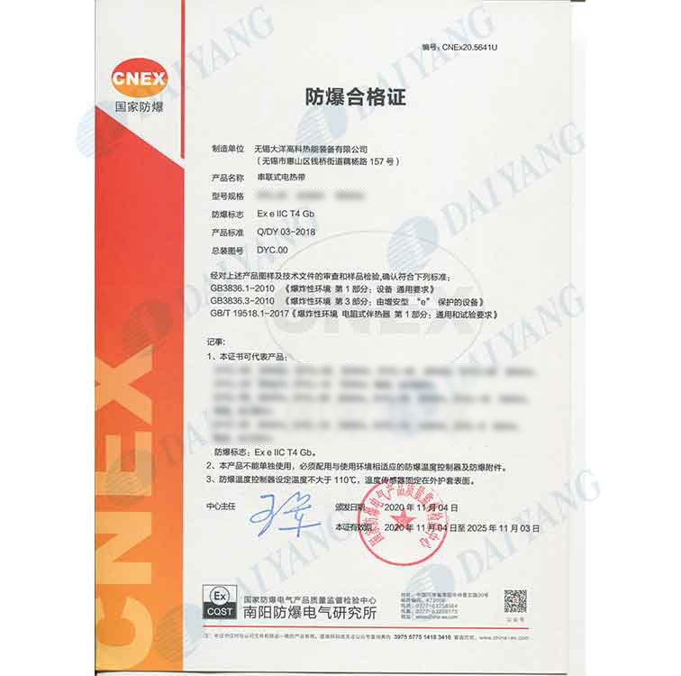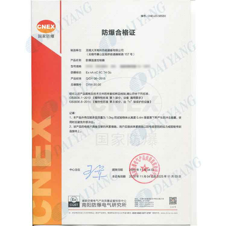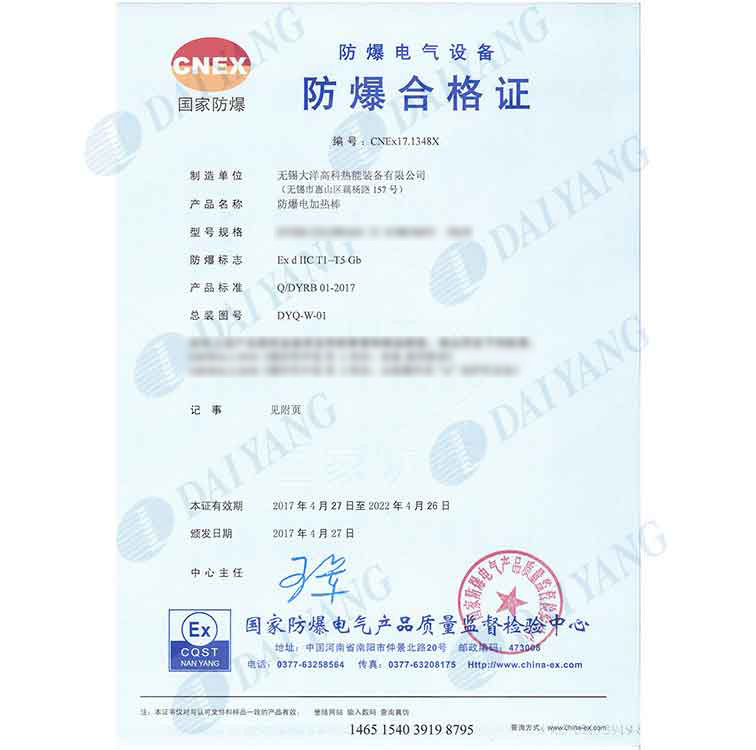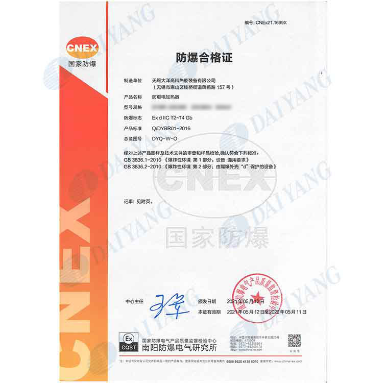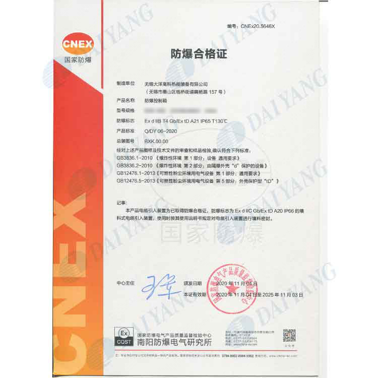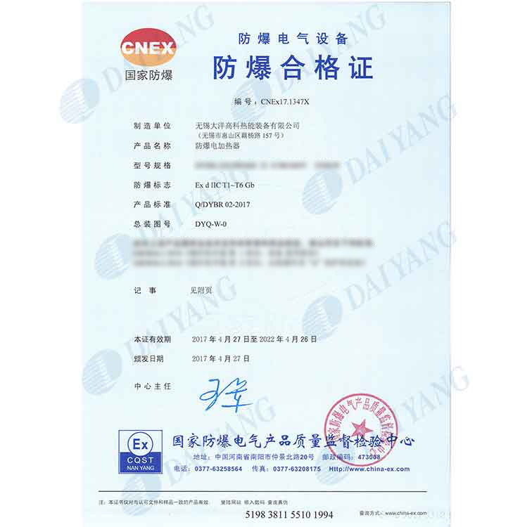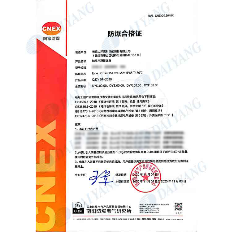 公司产品通过南阳防爆中心防爆认证,通过ISO9001、ISO14001、OHS18001体系认证,获得南阳防爆中心安装修理资格证书
